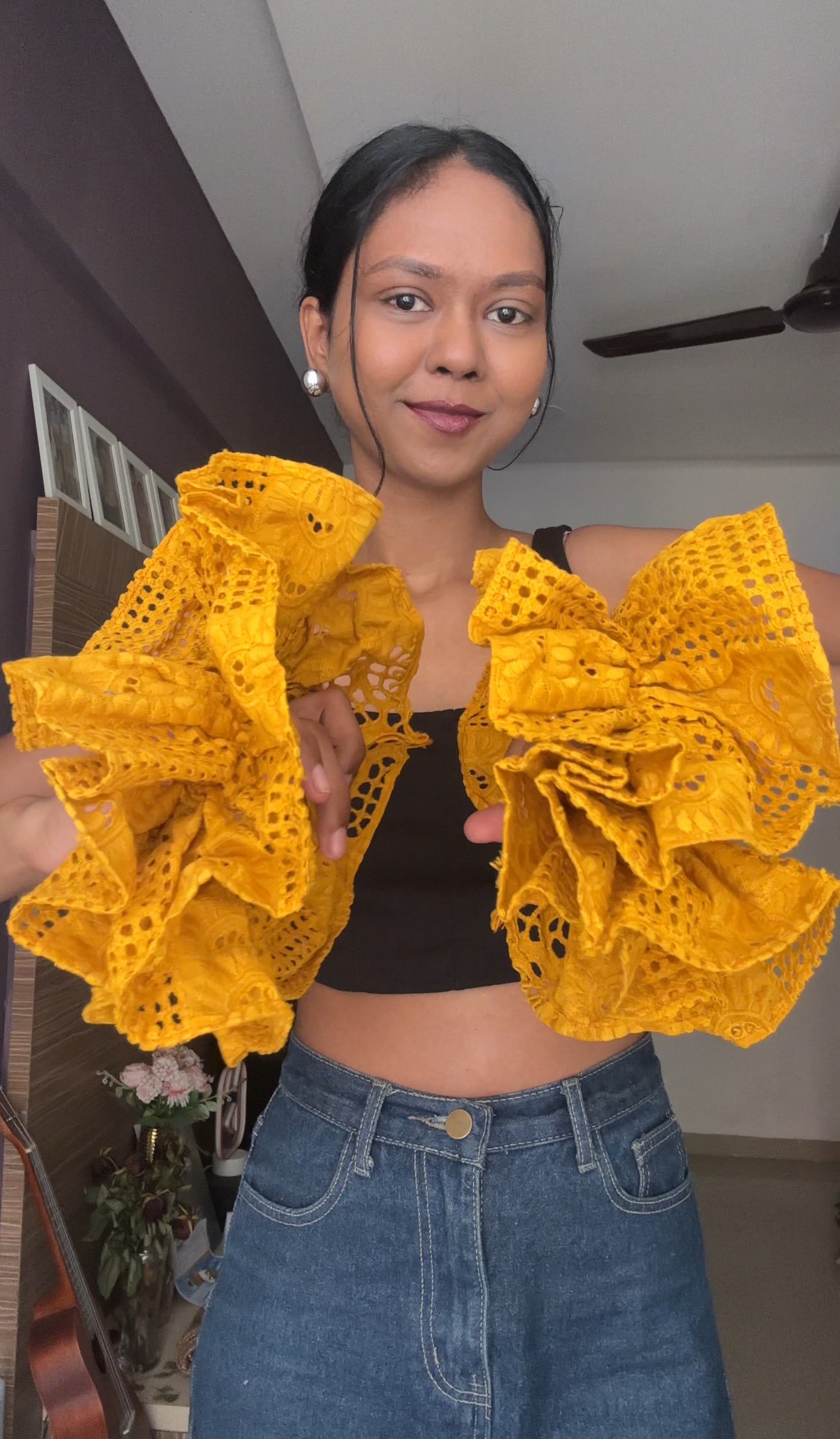 These Net Ruffle Sleeves Consist of 2 colours like Green & Yellow, so you can pair it with multiple colour combinations with your crop top / Dress.